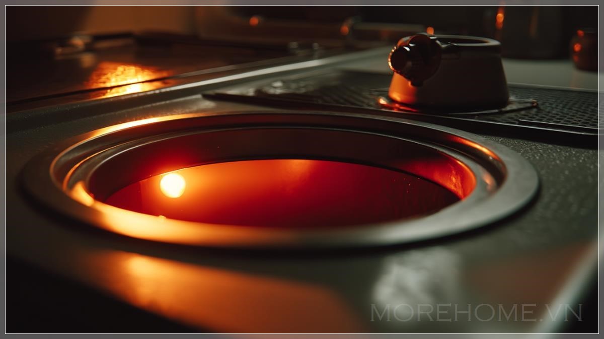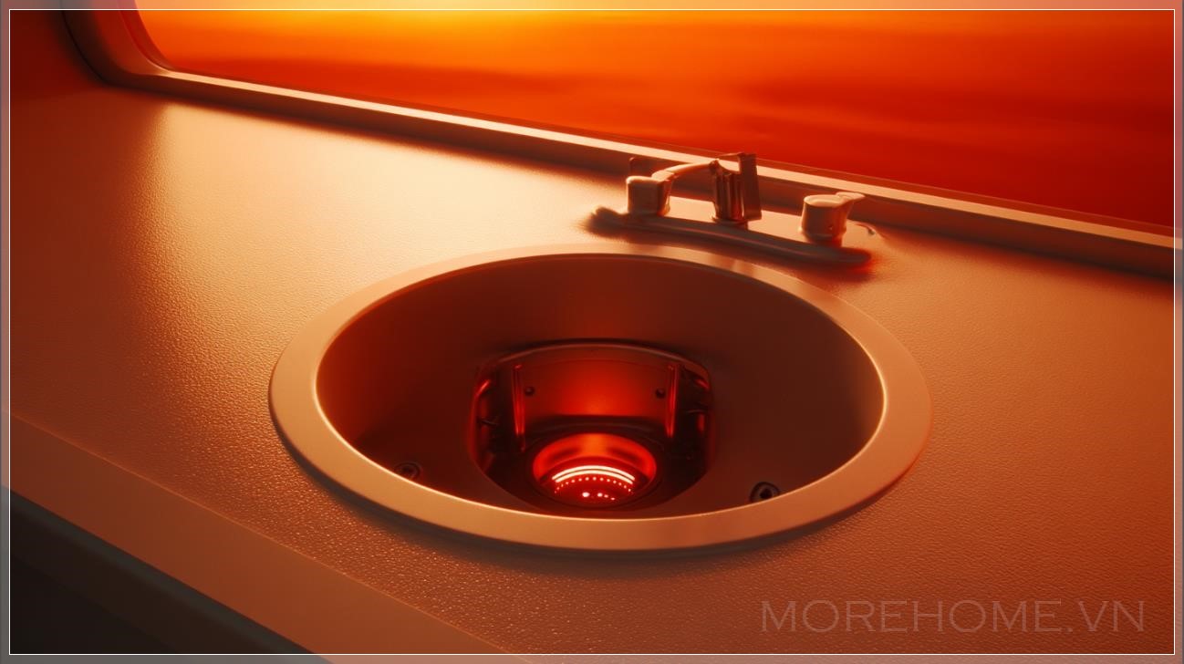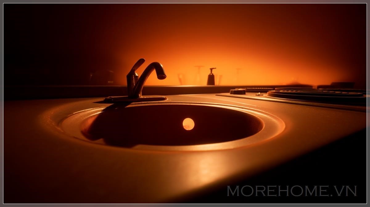 Điều thú vị trong thiết kế này là việc sử dụng ánh sáng như một công cụ chính để tăng cường không gian thẩm mỹ. Ánh sáng cam đỏ từ bếp không chỉ là nguồn sáng cho bồn rửa mà còn làm nổi bật các chi tiết nhỏ, tạo ra chiều sâu và sự phong phú cho không gian. Khi ánh sáng chiếu qua bồn rửa, nó phản chiếu các vết bóng và các chi tiết bề mặt, khiến cho chiếc bồn rửa không chỉ là một món đồ nội thất mà còn là một phần của nghệ thuật ánh sáng. Sự kết hợp của ánh sáng với các màu sắc ấm áp như đỏ và cam làm cho không gian trở nên sống động, đầy cảm xúc và gần gũi.