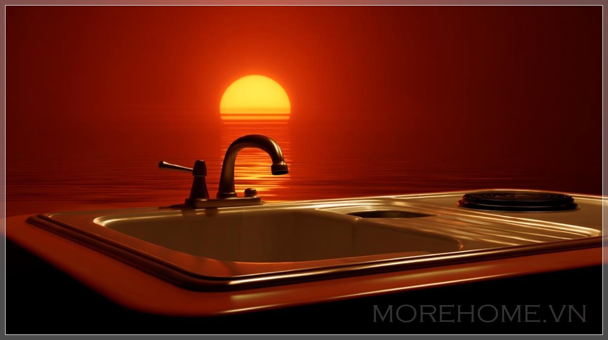 Bồn rửa với lỗ được thiết kế với những đường nét mạnh mẽ, có phần cổ điển nhưng lại toát lên vẻ hiện đại, phù hợp với không gian bếp retrofuturistic. Mặt bàn của bồn rửa được tối giản nhưng tinh tế, với chất liệu mực đen bóng, tạo ra sự tương phản mạnh mẽ với ánh sáng ấm áp từ bếp. Hình ảnh bồn rửa này không chỉ đơn giản là một món đồ nội thất mà còn phản ánh sự sáng tạo trong thiết kế, kết hợp giữa vật liệu hiện đại và những yếu tố của quá khứ. Đặc biệt, ánh sáng cam đỏ từ hoàng hôn không chỉ chiếu sáng không gian mà còn tạo ra một không khí đầy cảm hứng, như một bức tranh sống động của thế giới tương lai.