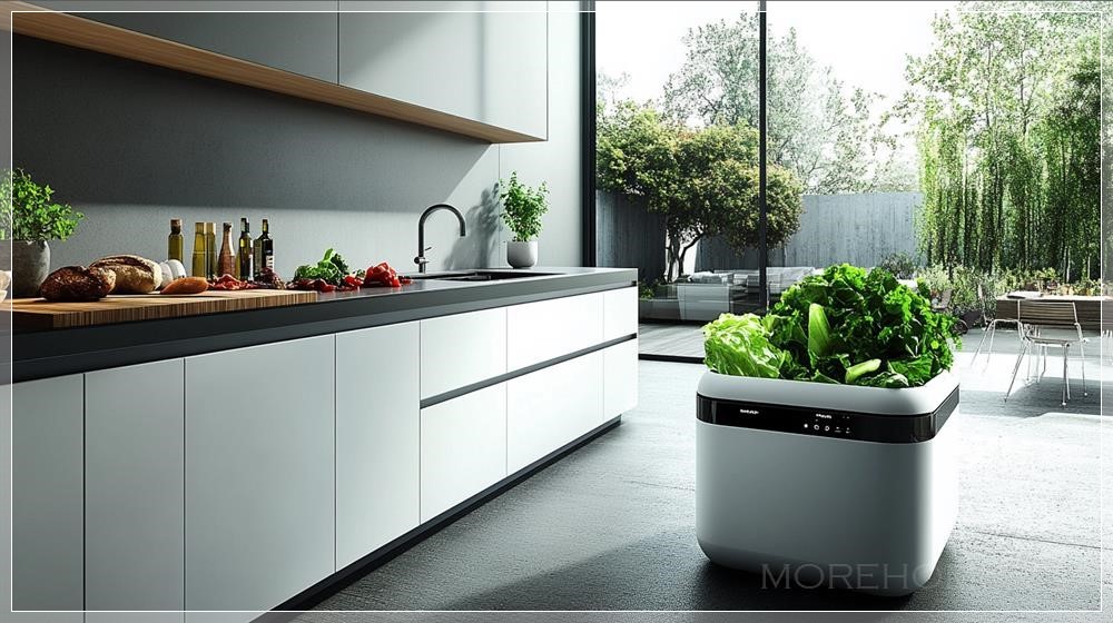 Trong thiết kế bếp này, điểm nhấn là hệ thống quản lý chất thải thực phẩm thông minh, bao gồm thùng compost với cảm biến hiện đại, và thiết bị xử lý chất thải thực phẩm tích hợp trực tiếp vào mặt bàn bếp. Những công nghệ này không chỉ giúp tiết kiệm không gian mà còn đóng góp vào việc giảm thiểu lượng rác thải ra ngoài môi trường. Thùng compost với cảm biến thông minh tự động nhận diện khi có chất thải thực phẩm và kích hoạt quá trình phân hủy tự nhiên, giảm thiểu khí thải và giữ cho không gian bếp luôn sạch sẽ và gọn gàng.