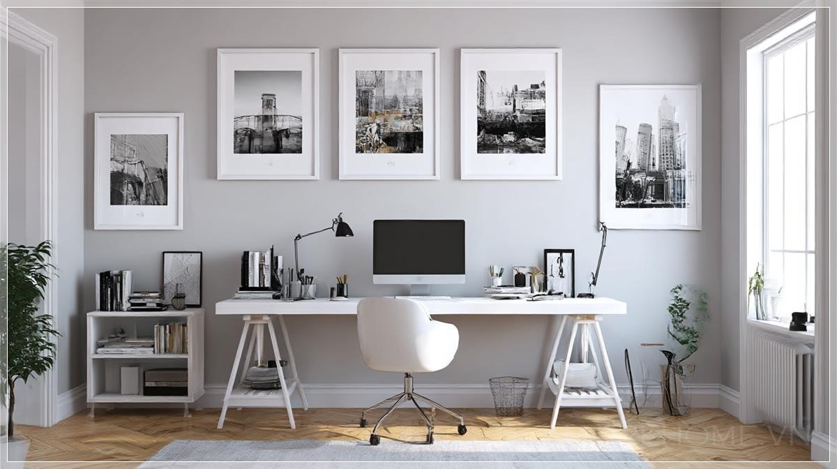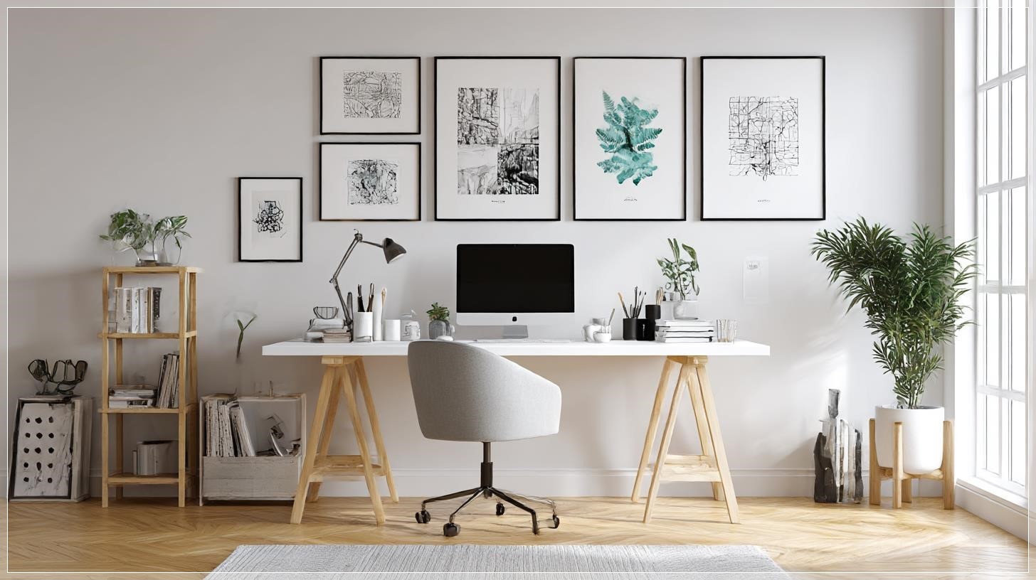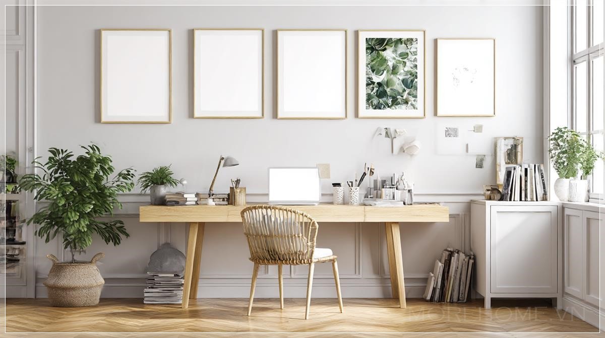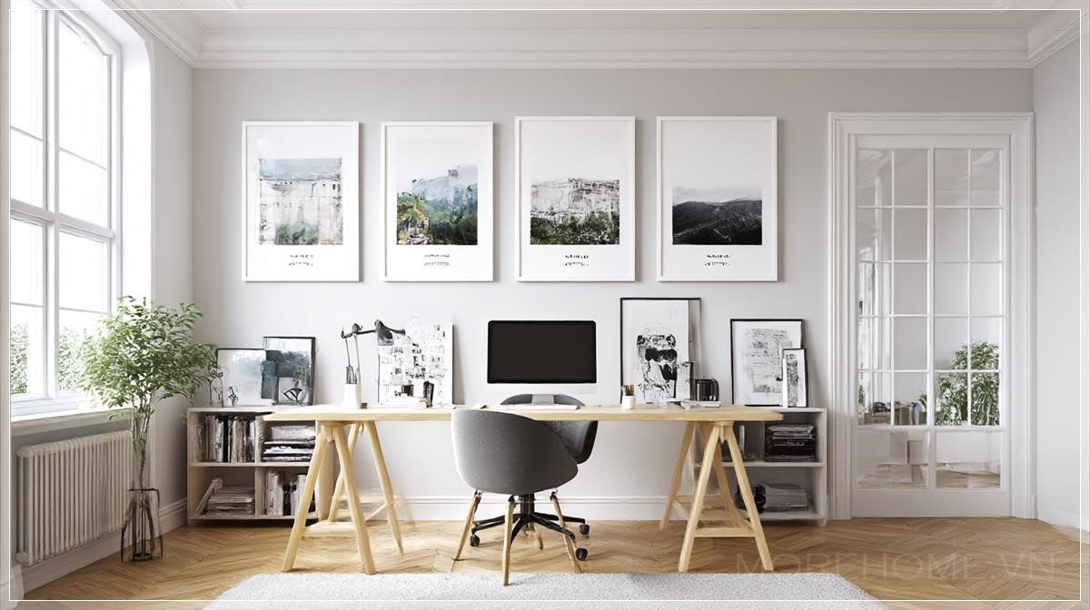 Phong cách Bắc Âu đặc trưng với việc sử dụng những màu sắc nhẹ nhàng và vật liệu tự nhiên như gỗ, tạo nên không gian mở và thoáng đãng. Màu trắng được sử dụng chủ yếu, không chỉ cho các bức tường mà còn cho các chi tiết trang trí như khung tranh. Trong ví dụ này, bức tường được trang trí với năm khung tranh A3 cùng kích thước, tất cả đều có màu trắng với poster trắng đơn giản. Điều này không chỉ mang đến một không gian sạch sẽ, tinh tế mà còn tạo ra cảm giác đồng nhất, giúp tâm trí thư giãn khi làm việc. Những bức tranh đơn giản, không có họa tiết rối mắt, giúp tạo sự tập trung và làm nổi bật các yếu tố thiết kế khác trong không gian.