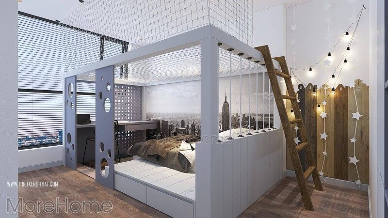 Không gian phòng ngủ được thiết kế theo phong cách thể thao, chiếc giường bằng gỗ công nghiệp vuông vắn hiện đại với gam màu trắng ưa nhìn.