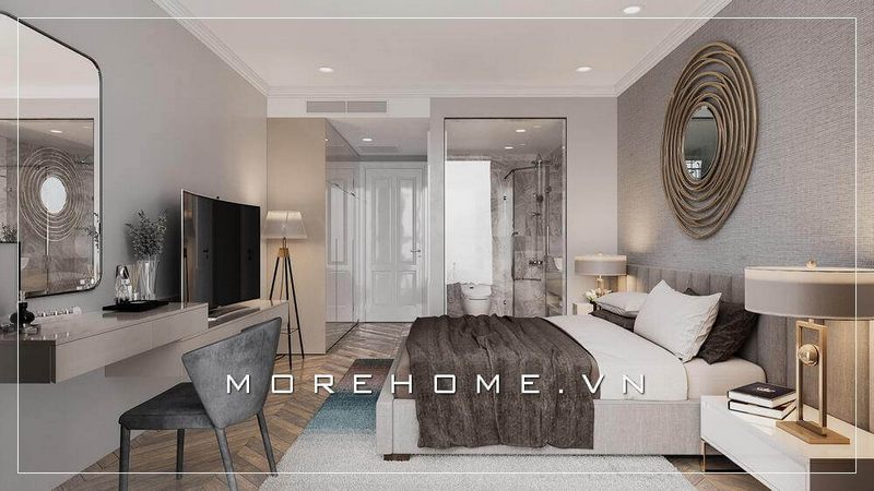 Nội thất phòng ngủ mang phong cách tân cổ điển pha chút hiện đại là sự kết hợp ăn ý giữa việc lựa chọn nội thất của chiếc giường khung gỗ hiện đại và tinh tế khi được đặt gần ngay cửa kính trượt ban công đẹp, rộng rãi hiện đại để đón ánh nắng tự nhiên của thiên nhiên.