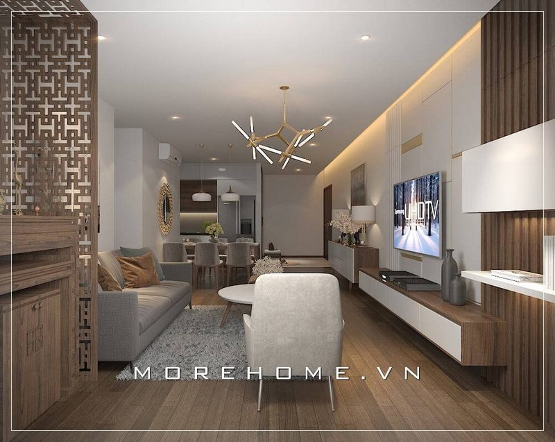 Không gian phòng khách căn hộ chung cư đầy ấn tượng từ bộ sofa khung gỗ óc chó cao cấp được thiết kế theo phong cách hiện đại kiểu dáng văng tiện nghi.