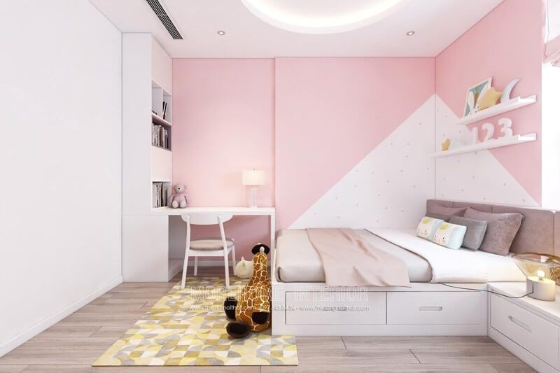 Tone chủ đạo cho phòng ngủ bé gái là hồng-trắng rất dễ thương và đẹp. Nội thất căn phòng ngủ phù hợp với lứa tuổi. Phòng ngủ tận hưởng được ánh sáng tự nhiên nhờ cửa sổ lớn tạo cảm giác thông thoáng cho căn phòng ngủ cho bé.