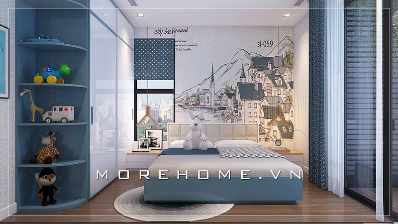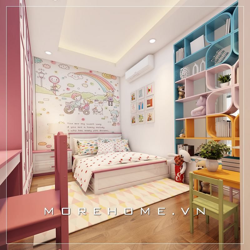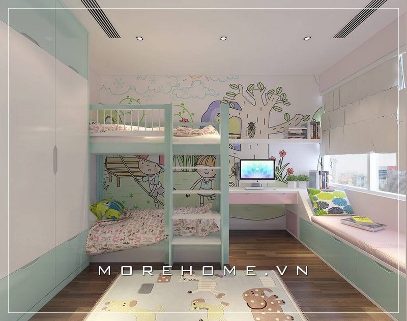 Sự kết hợp hoàn hảo giữa giường ngủ gỗ công nghiệp, tủ quần áo kịch trần, bàn học... mang đến cho con một không gian học tập và vui chơi thoải mái nhất