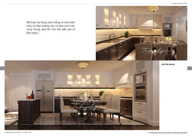 Mẫu thiết kế phòng ăn và phòng bếp ngay trong cùng một không gian nên thuận tiện để bày biện bữa ăn của gia đình. Cách sắp xếp thông minh theo phong cách tân cổ điển hướng cách tân gần gũi, thoáng đãng phù hợp cả cho biệt thự, nhà phố, chung cư cao cấp.
