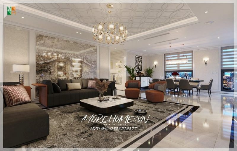 Một mẫu thiết kế phòng khách hiện đại được tạo ra để phù hợp với căn hộ sang trọng, đẳng cấp. Tone màu xám của nội thất độc đáo được kết hợp với nhau để tạo nên một không gian hài hòa, ấm cúng và thu hút.
