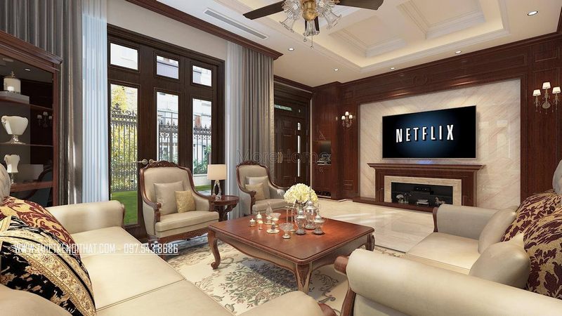 Sofa vải đẹp, hiện đại được thiết kế để phù hợp với khu vực phòng khách của nhà biệt thự hai tầng.