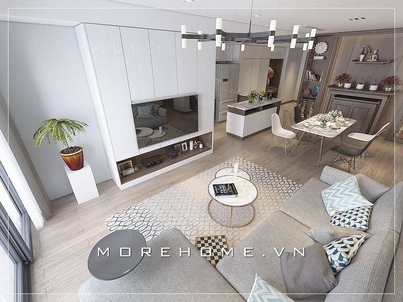 Mẫu thiết kế nội thất cho căn hộ hiện đại với tông màu trắng bé làm chủ đạo sẽ tạo ra một không gian sống tiện nghi và thân thiện cho người sử dụng.